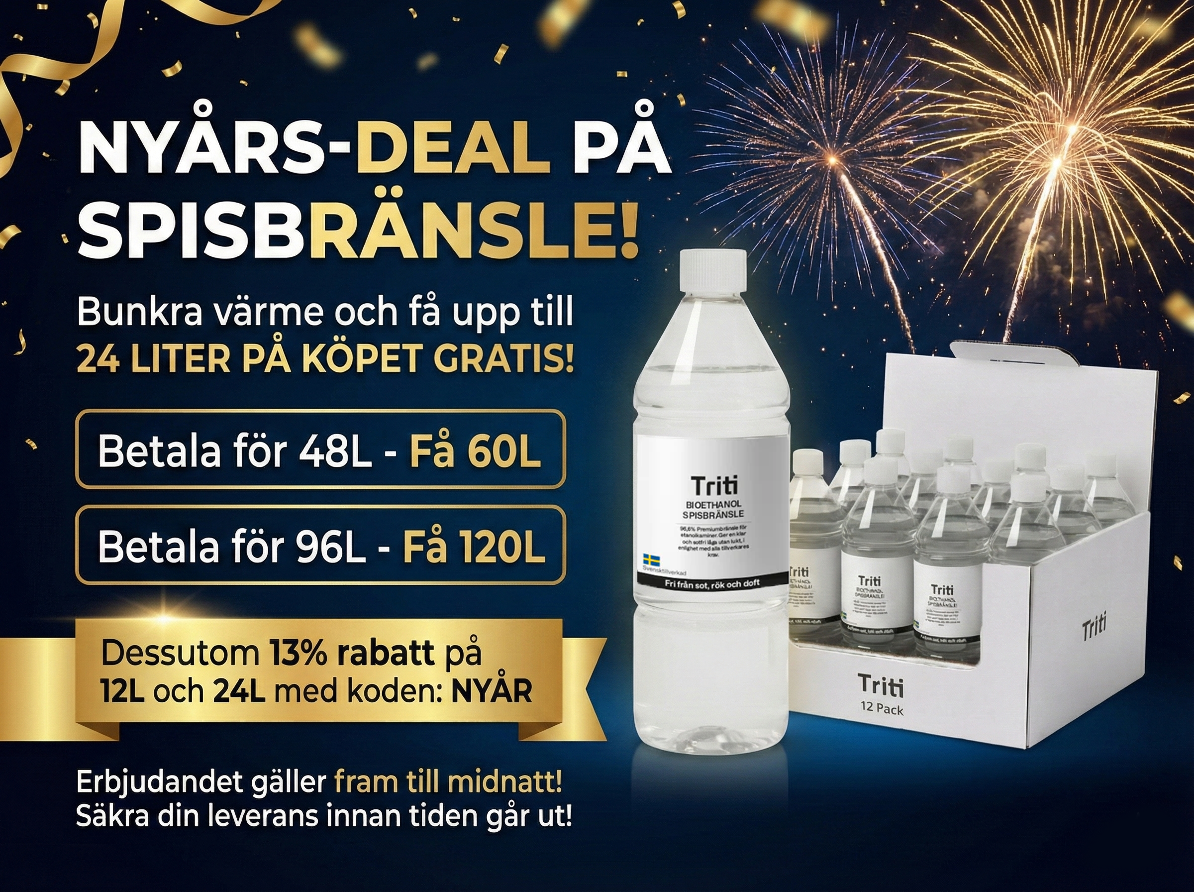 Triti® Bioetanol er fremstillet lokalt i Sverige af højkvalitativ etanol og genom en holdbar proces med ingen affald. Vores produkt har 96% renhed, hvilket garanterer en jævn, ren låga uden oönskade biprodukter som sot eller røg. Derudover tilbyder vi en pris på markedet for premium bioetanol.